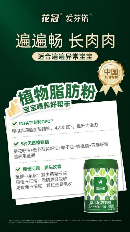以国产高端奶粉品牌花冠为例,其携手全球知名原料供应商打造的植物脂肪粉,通过结构、来源与技术上的重新设计,直面脂肪在吸收、利用全过程上所面临的诸多挑战,从而为系统性改善婴儿便便异常、提升营养摄取效率提供了关键技术支撑。