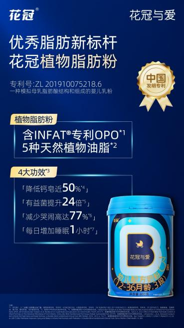 花冠的植物脂肪粉选用了瑞典 INFAT® 专利 OPO 结构脂【1】【2】。该成分将更多棕榈酸定位在甘油三酯的 sn-2 位,从结构上模拟母乳脂肪。临床显示,该结构能减少钙皂生成近50%,软化便便【3】,提升有益菌增殖近24倍【4】,从而间接减少婴儿的哭闹率近77%【5】,延长每日睡眠时间近1小时【6】。